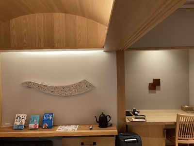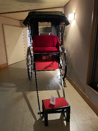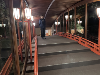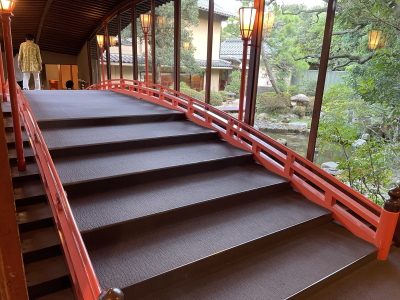 チェックインはいつものようにお部屋で行うため、まずは館内説明を受けながら部屋まで案内していただく。歴史ある旅館を改装したようで、回廊式の2階建て。エレベーターはなく階段もところどころあるが、赤い太鼓橋や灯篭など通路も飽きない工夫が施されている。