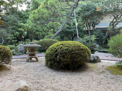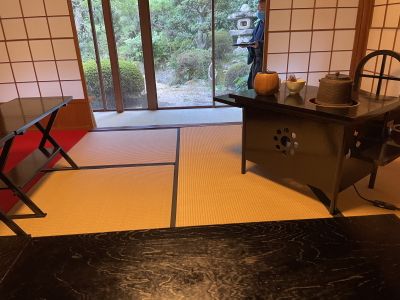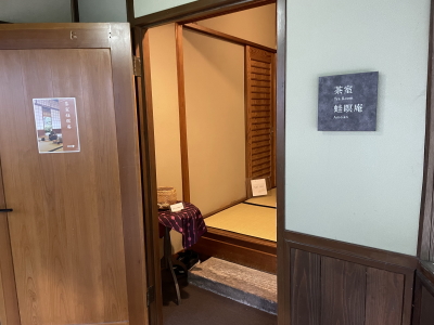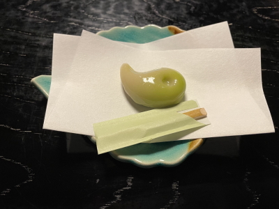 16時30分、ロビー近くの中庭にある茶室 蛙瞑庵(あめいあん)で勾玉の和菓子とお茶をいただく。お茶の先生からは、松江のお茶の歴史などのお話を聞きました。