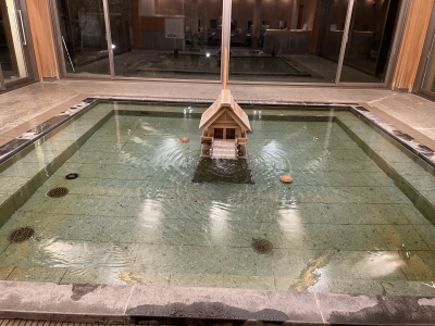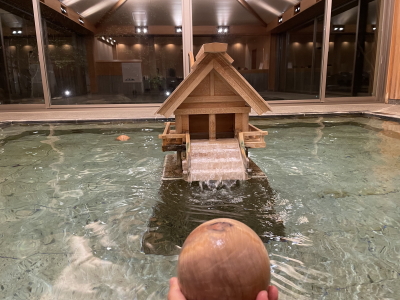 夕食前に大浴場へ。内湯には、出雲大社のかつての宮殿を模したような建物があり、そこから湯が流れていた。手触りのいい丸い球が3つ浮いていた。