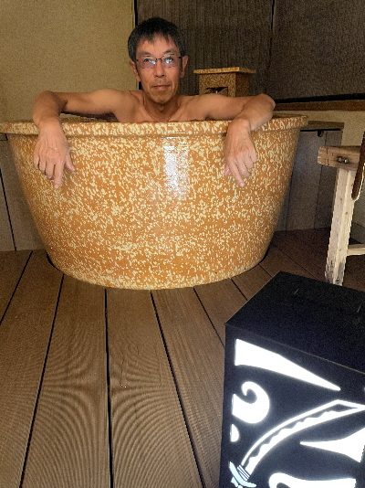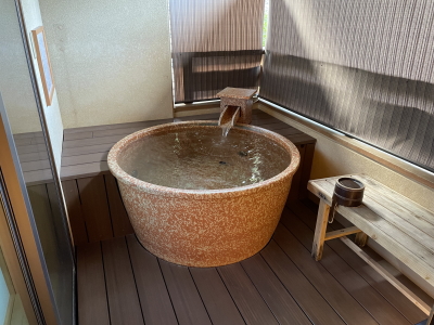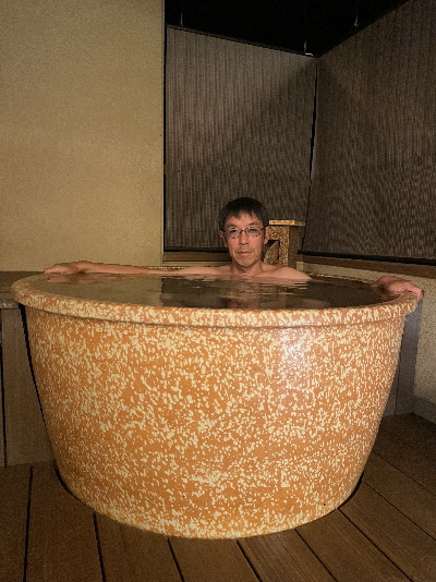 夕食後は部屋でまったりした後、部屋付きの露天風呂に。深くてあったかくて気持ちいい湯舟でした。ばーちゃんは私たちがご当地楽を見学している時間にゆっくりと露天風呂に浸かったそう、かーちゃんも翌朝、私が散歩している間に入ったとのことでした。もう、最高…と。