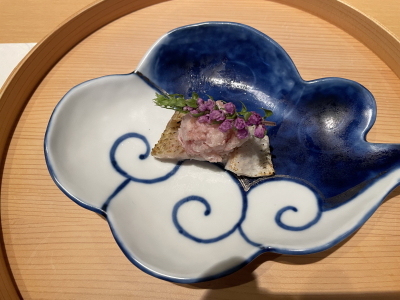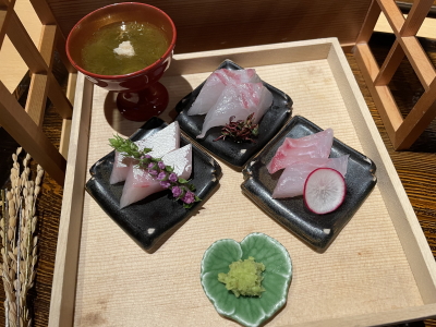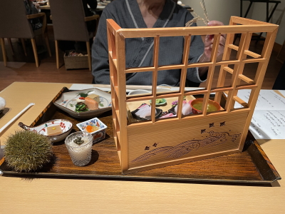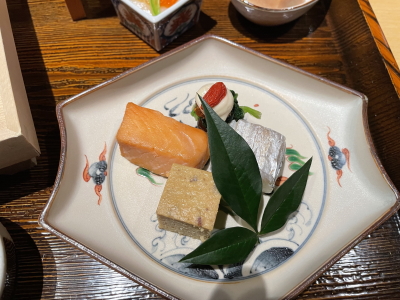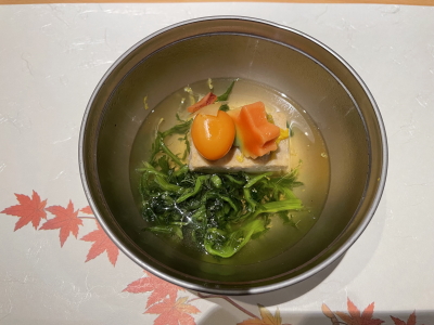 先付はのどぐろの炙りに生ハム、ゆず大根が載せられている。煮物椀は錦秋(きんしゅう)鶏真薯(とりしんじょ)、菊菜、玉子柿、紅葉麩。