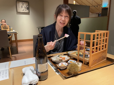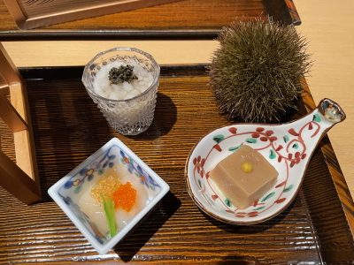 本物のイガグリに落花生豆腐、つくね芋の麦とろ仕立て、炙り太刀魚寿司など。