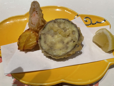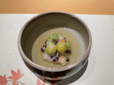 揚げ物は帆立、海老のから揚げに野菜天麩羅、椀物には海老、銀杏、ゆり根。