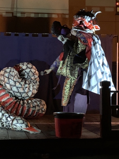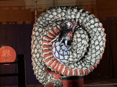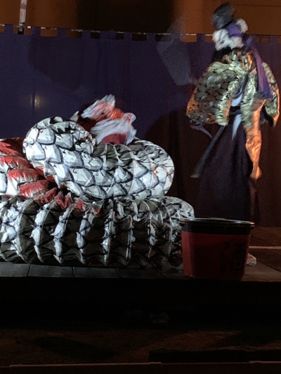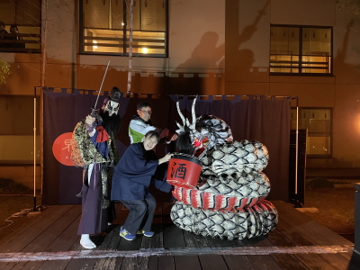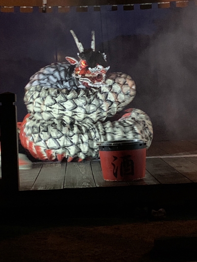 神々の国・島根に伝わる伝統芸能「石見神楽」のご当地楽。ヤマタノオロチ伝説を題材にした「大蛇(オロチ)」、大国主命が退治する神楽。途中、大蛇に呑ませる酒の醸造の手伝いをさせていただきました。
