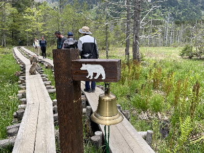 多少雲がかかっているもののかえって神秘的に映える穂高連峰を愛でながら散策。綺麗な写真もたくさん撮れた。遊歩道の木の板を歩いていると3匹のサルに遭遇。観光客を威嚇している。目を合わせないようにして横を通り過ぎる。