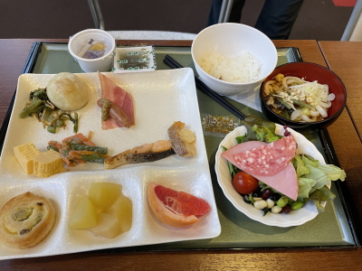 2日目。朝から結構な雨。6:30から朝食。10分前に朝食会場に着いたがすでに50人ほど並んでいた。それでも席はたくさんあるので、空いている料理を選びながらトレイを満たしていった。やはり、わさびドレッシングの効いたサラダが美味でした。