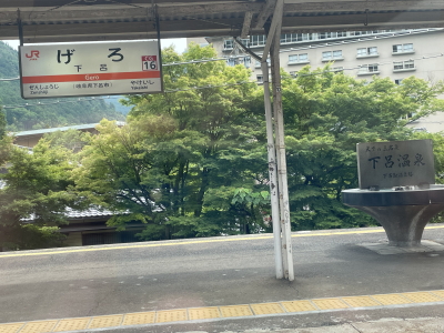 クラブツーリズムの他のツアーもいくつか集合しており、その中からツアー番号とツアー名を探す。旗を持った添乗員さんを見つけ名前を言ってバッチを貰う。7:10集合時間、参加者は39名、香港・台湾の方が2組4名いた。乗車前に列車割り振り表をくじ引き、6番AB(帰りのくじ引きは6番CDだった)。ホームに入場しコークオンでお茶とコーヒーを買って車両に乗り込んだ。7:43出発。高山まで約2時間30分。写真は途中の下呂。