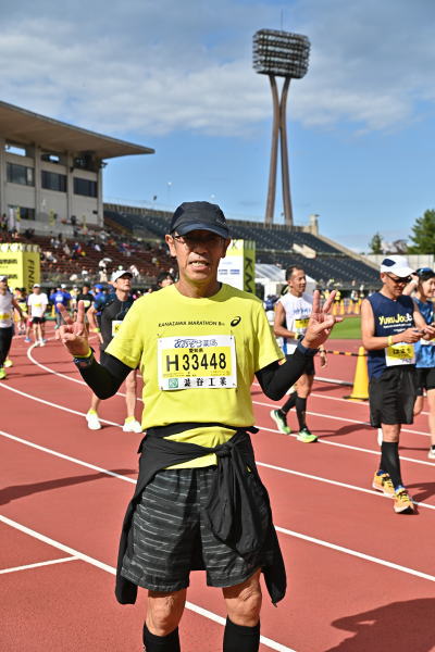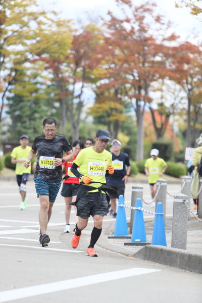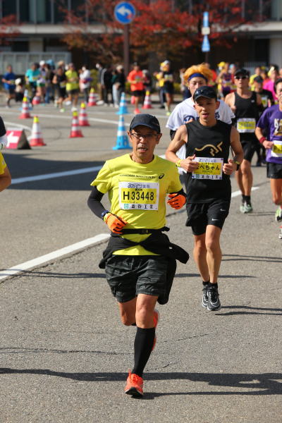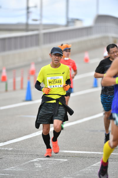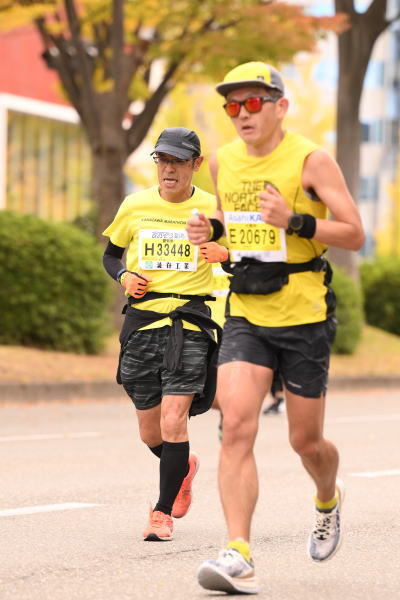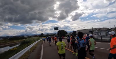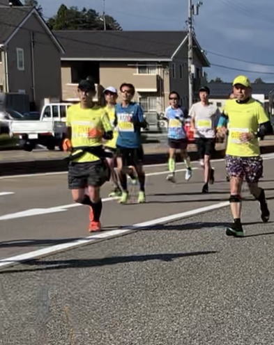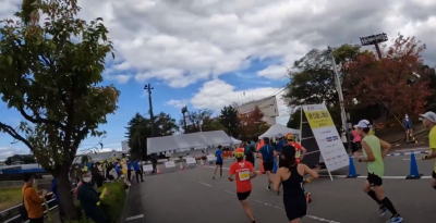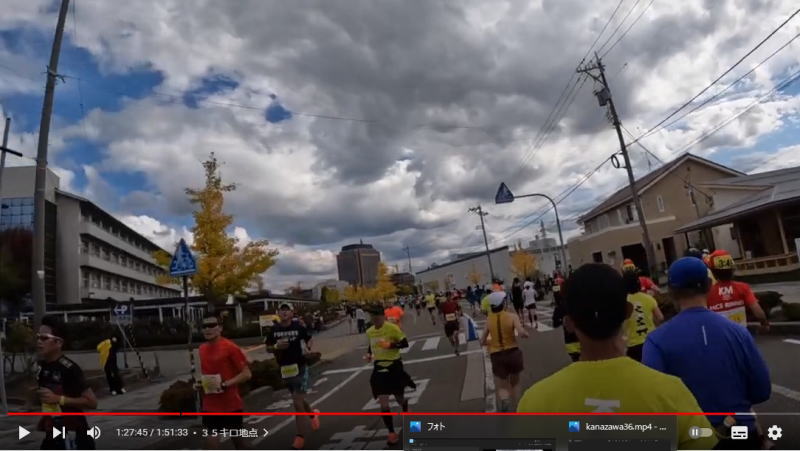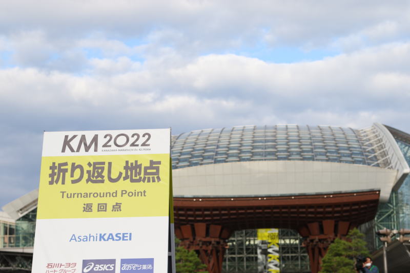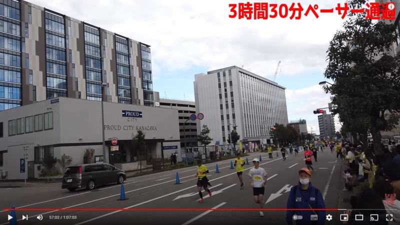 YouTubeの【金沢マラソン】コース紹介(3時間45分ペーサー目線)後半の動画の中で、1:16:12~30あたりで抜かれ、その後の折返し手前の様子も1:27:44あたりで映っていました。