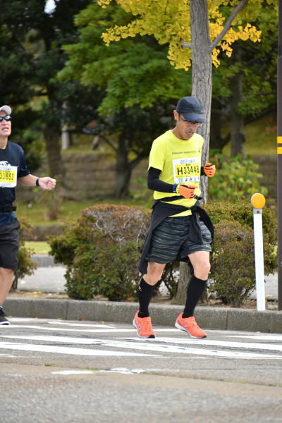 34キロで再び金沢駅西口へ戻る。前日のコース巡りではここまでだったので、ここから先はYouTubeの動画でチェックしたのみ。50m道路で直線が延々と続く。我慢のしどころだが、このあたりから足が動かなくなる。集中力ももたないようだ。