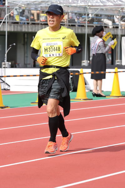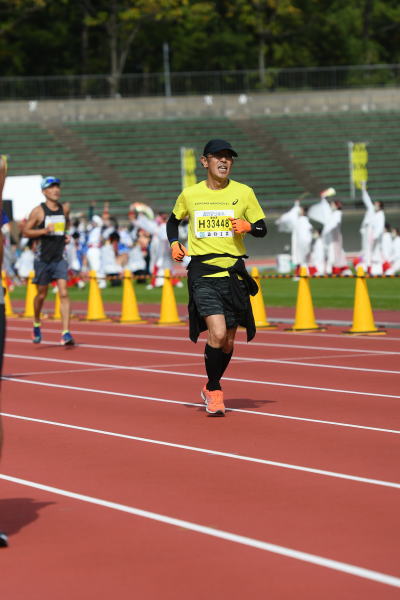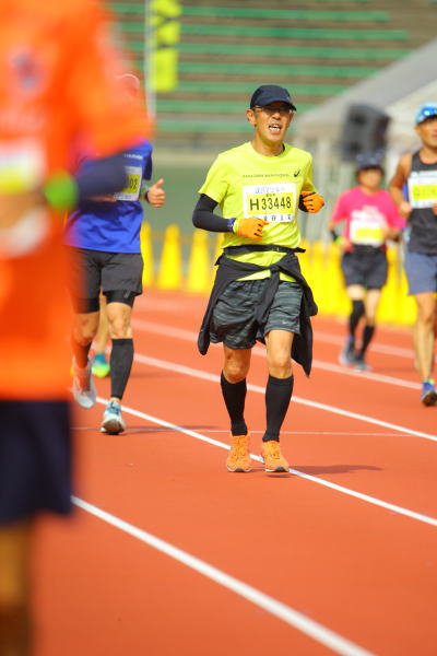 あと1キロの看板を越えたら示野橋だ。「お帰りなさい!」と温かい声援。後は西部緑地公園を抜け陸上競技場を目指すのみ。ゲートをくぐるとゴールまではわずか。最後の力を振り絞ってトラックを駆け抜ける。