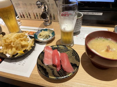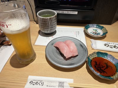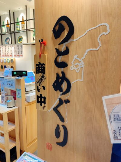 前日受付もてなしドームでいただいた「ビール一杯おごりますフェア」を実施中のクロスゲート金沢へ向かうことにした。中華料理やおでん、炭火焼ステーキにうなぎとお店もたくさんあったが、「のとめぐり」というお寿司屋さんに決めた。
