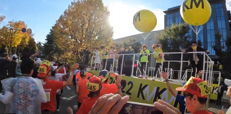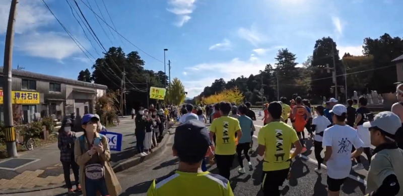 YouTube定点カメラ映像の30分05秒くらいから、駅前折返し走っている私が映っていました。黄色の大会Tシャツにオレンジのシューズと手袋、腰にウインドブレーカーを巻いて走っています。