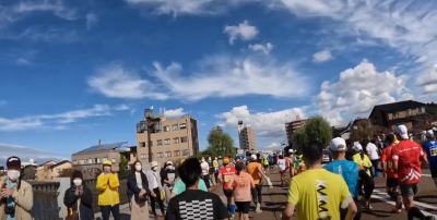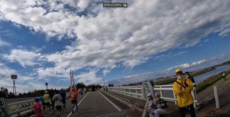 上の写真は、YouTubeの【金沢マラソン】コース紹介(3時間45分ペーサー目線)後半の動画の中で、55:02あたりで映っていたかーちゃんの様子。私はこの時よりは3分ほど先を走っていました。