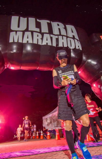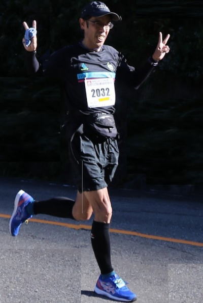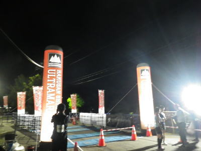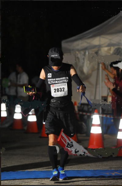 あと1キロ。気が付くと日は落ちて暗くなっていた。ゴール地点手前で名前を呼ばれそのままゴールへ。ゴールテープを切ることができました。