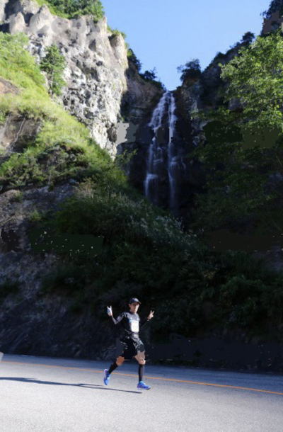 水被りは25.9キロエイドのふくべの大滝からは毎回エイドの度に頭、首に3回ほど被る。給水は一気に飲まないようにし、コーヒーボトル缶に補充し走りながらこまめにとり続ける。