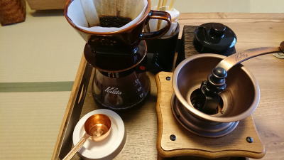 部屋に入るとコーヒー豆を挽くセットもあり、いつもレース前は飲まないコーヒーもいただきました。