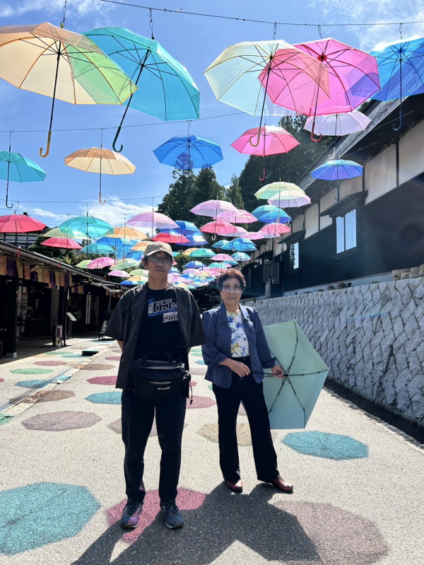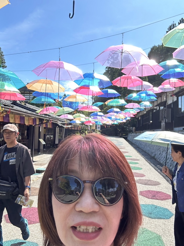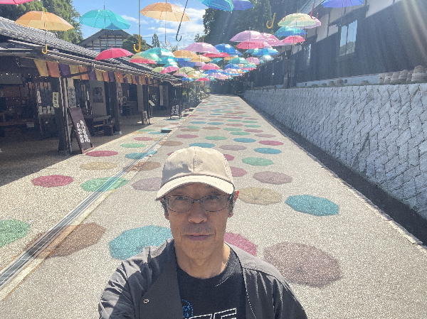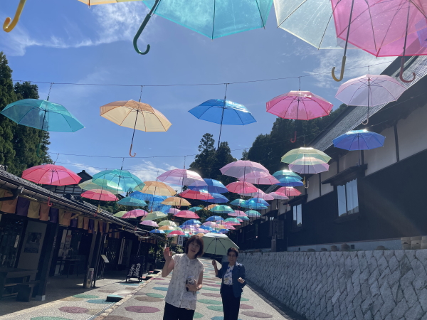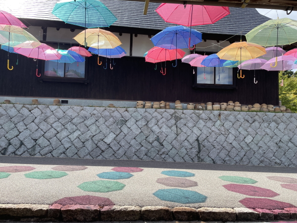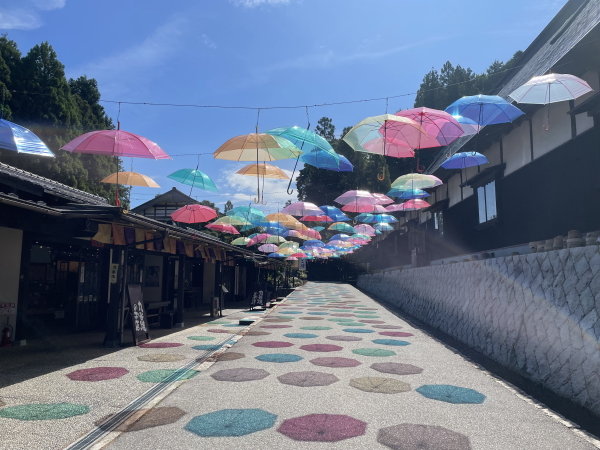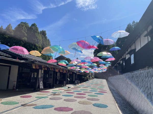 最初のビューポイントはアンブレラスカイ。色とりどりの傘が頭上に飾られ、写真映えするような綺麗な景色が広がる。 地面に色鮮やかな傘の色が映し出されて不思議の国に迷い込んだみたいだ。
