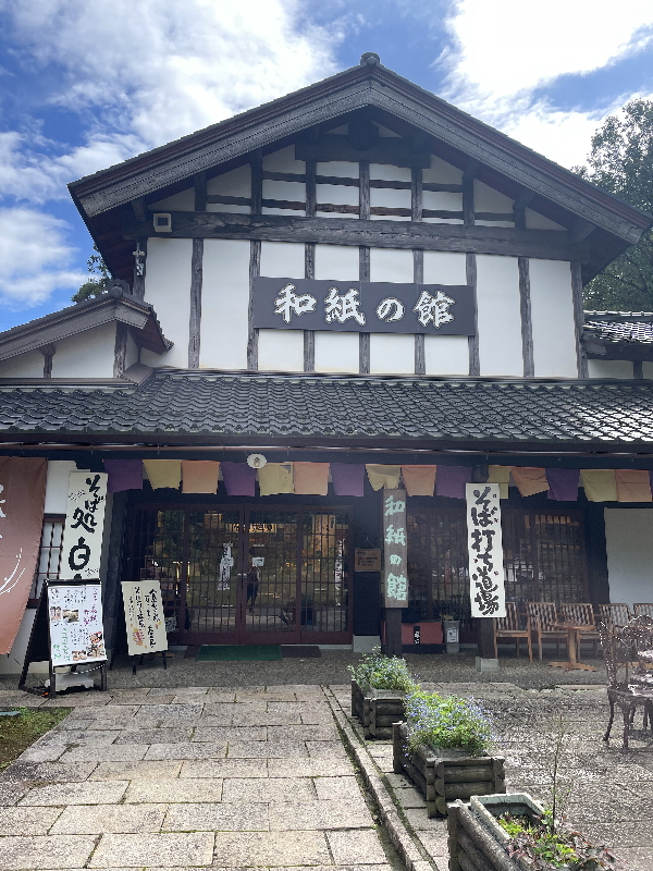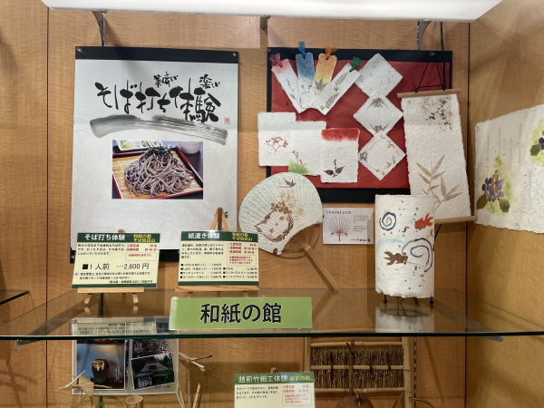 和紙の館ではそば打ち体験と紙漉きが体験できます。外国人の親子が申込んでいました。