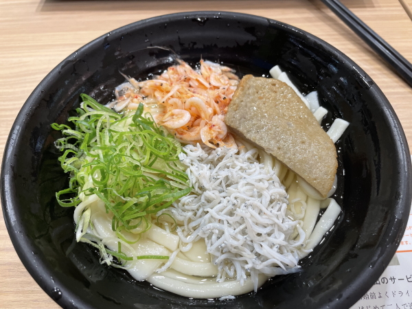 そこから60キロ走って静岡SAで再び充電して96%。充電中に三宝うどん、桜かき揚げうどん、月見うどんをそれぞれ頂く。