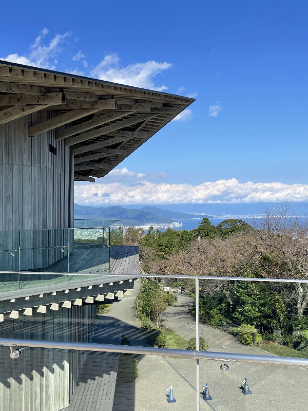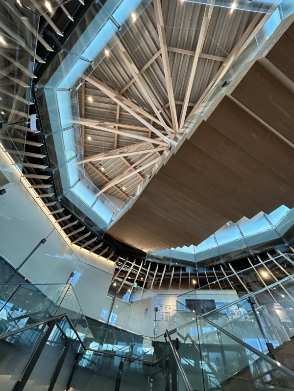 建物1階の展示エリアから階段で2階ラウンジを通り3階展望フロアへ。