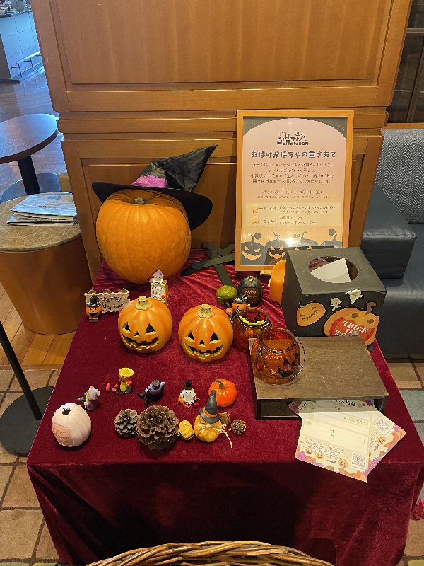 お腹いっぱい、大満足の夕食でした。ロビーのハロインの飾りつけが素敵でした。