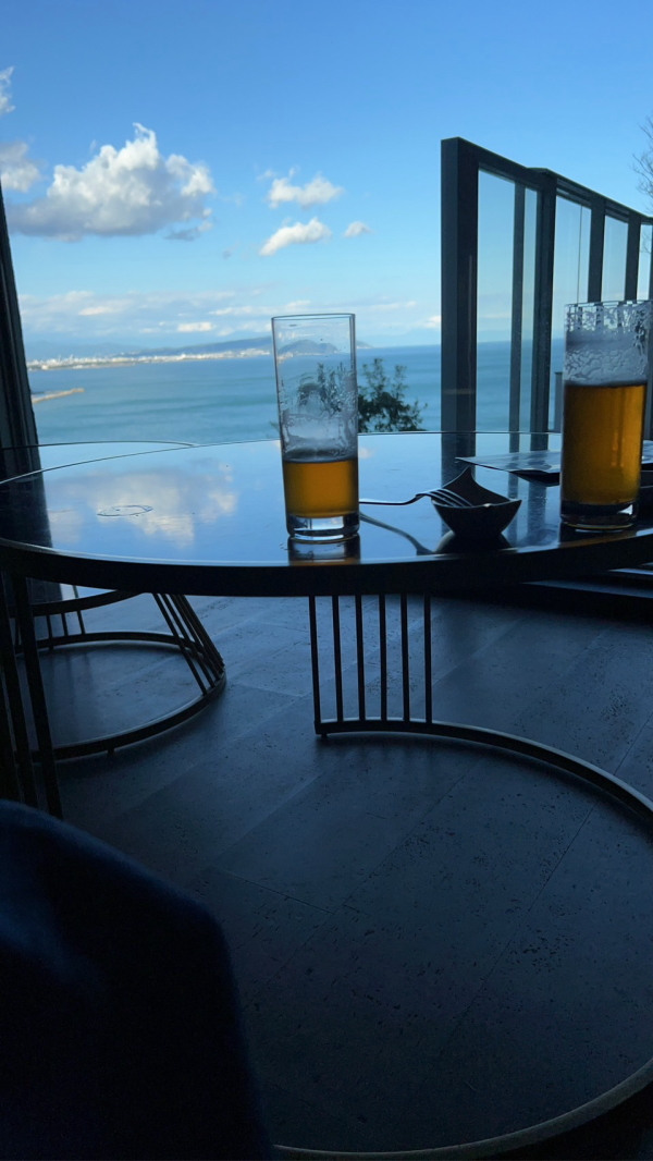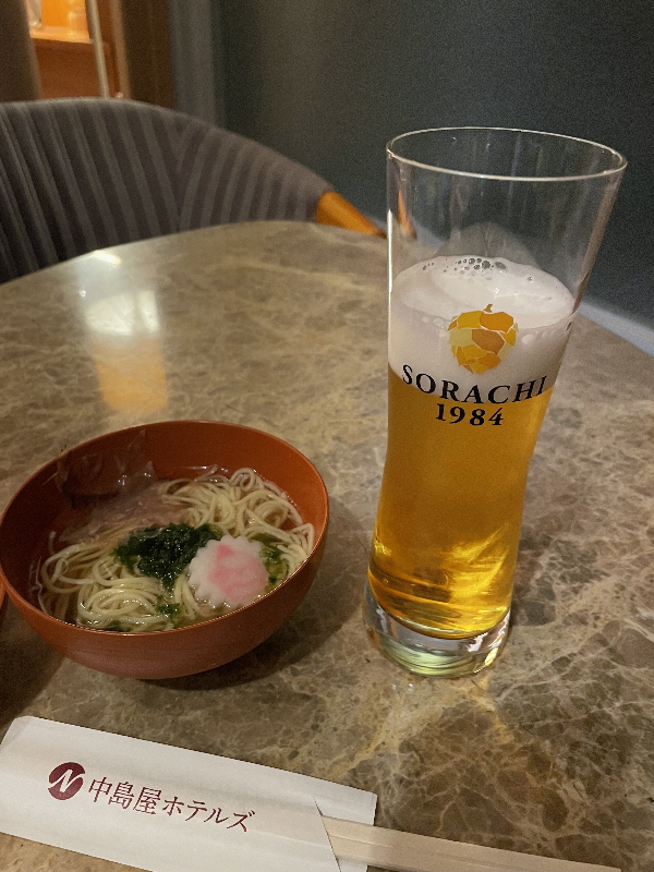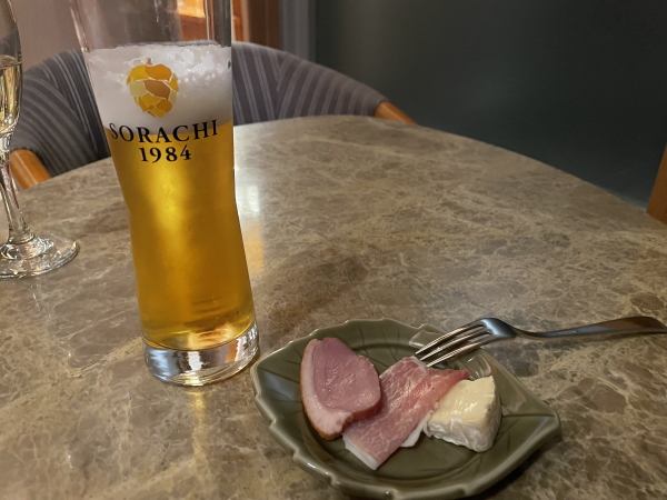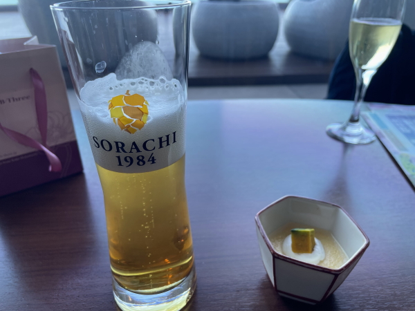 スタッフの案内でベイテラス&ラウンジへ。チェックインは15時だが、ここは14時から利用できる。早速ビールとスイーツを頂く。