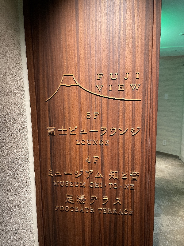 オールインクルーシブの宿。いろいろ回って楽しまねばと、すぐに富士ビューラウンジへ。テラスからは富士山(雲にかかっていたようだ)、階下の足湯テラスが見える。