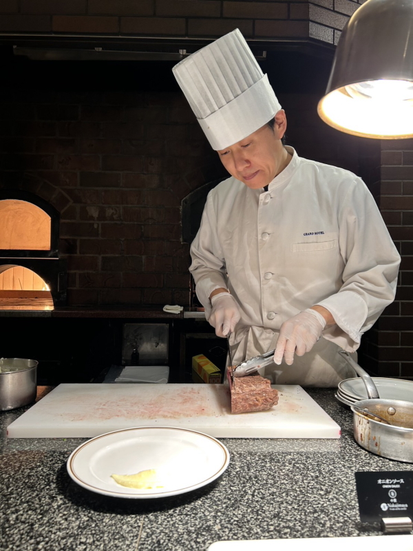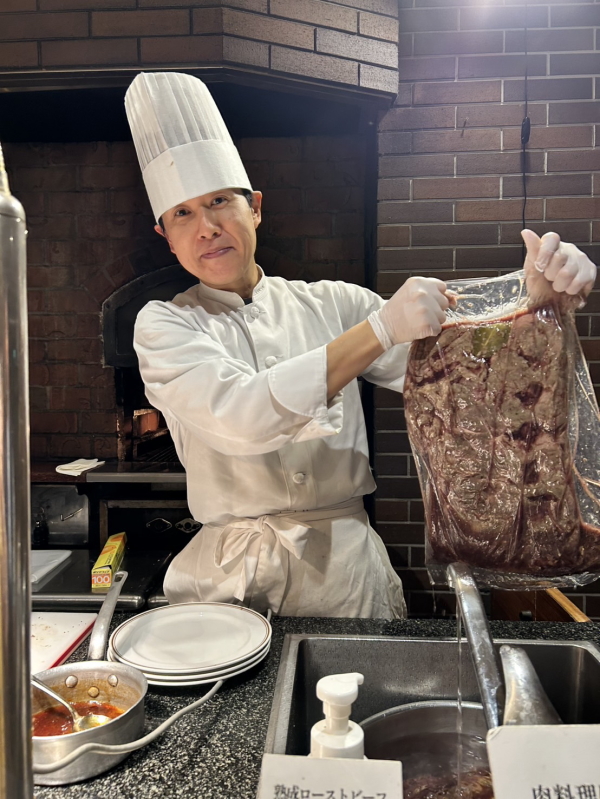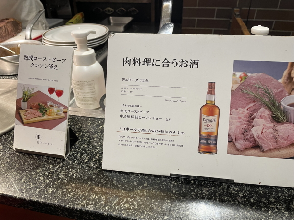17時30分から夕食。ライブキッチンで熟成ローストビーフクレソン添えをリクエスト。袋ごと持ちあげていただき写真を撮らせていただきました。