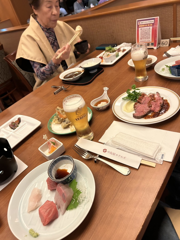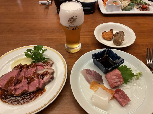 ローストビーフ、刺身に天ぷら、唐揚げ、エビチリなど勢ぞろい。そしてビールで乾杯。
