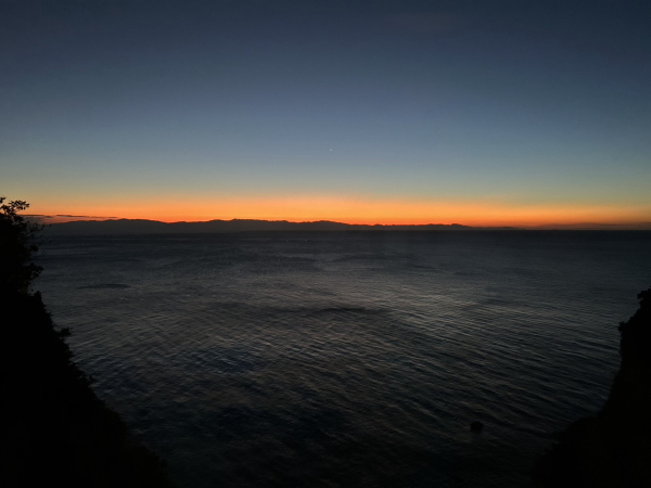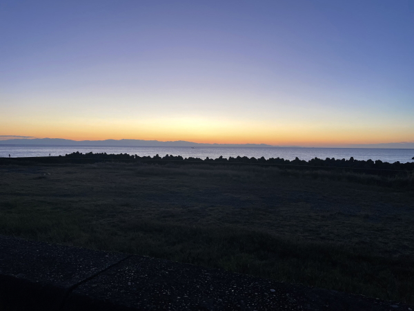 翌朝、夜明け前に近くの海水浴場まで散歩。日の出前の海と空が幻想的でした。