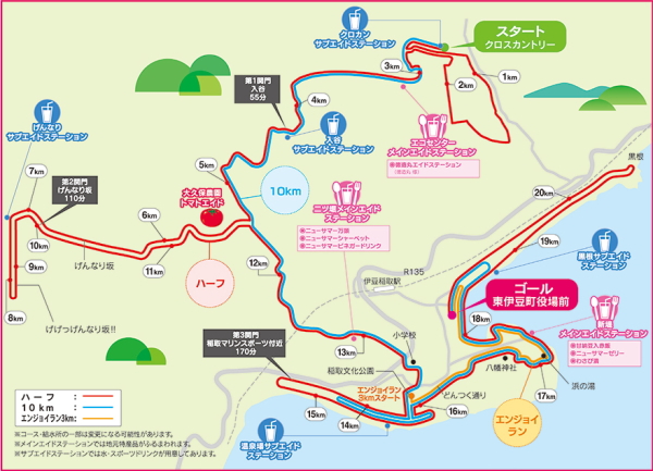 12キロ過ぎで40分後にスタートした10キロランナーと合流。このあたりはずっと下りになるのだが、おなかの調子がおかしくなってきた。13キロのシャーベットがおいてあるエイドでトイレに駆け込む。ちょうど多目的トイレがあいていたので事なきを得た。このところ毎回途中でトイレストップしている。メンタルの問題だろう。