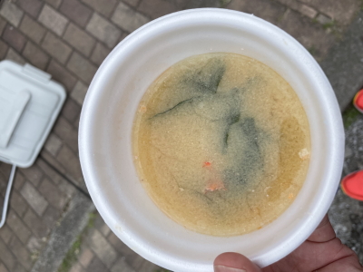 ゴール後はキンメ汁の長蛇の列に並ぶ。やっとの思いで手に入れたキンメ汁は塩分が強く全部飲みきれませんでした。