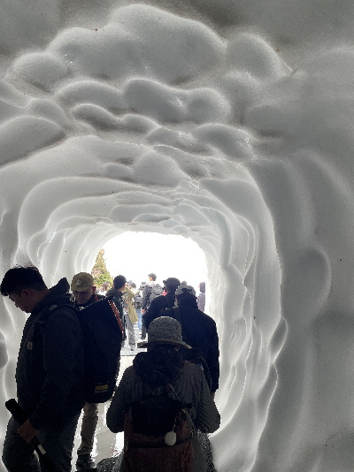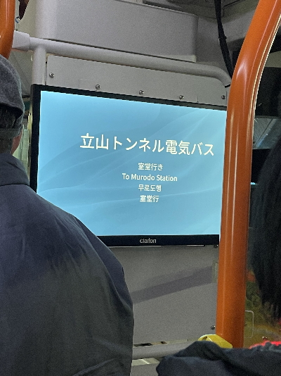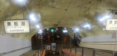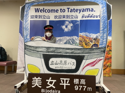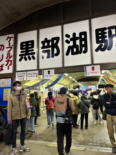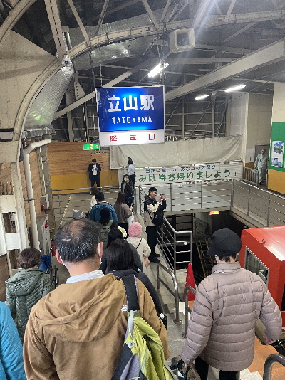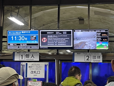 大観峰で雪のトンネル、展望台からの黒部湖を満喫。集合時間になり改札で整列してると「室堂は風が強く雪の大谷へは歩いていけない」との案内が入る。ここまで予報に反してホテルから扇沢駅までのバス移動中以外雨が降ることもなく、神がかり的な天気だったが、強運もこれまでかとがっかりしながら、立山トンネル電気バスに乗り込み室堂へ出発する。
