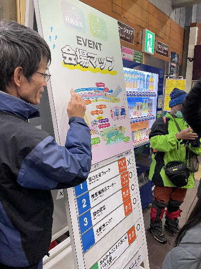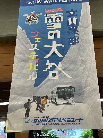 立山の直下を通り10分程で室堂へ到着。室堂ターミナルではEVENT会場マップの看板に雪の大谷ウォークが終日×と案内されていた。そのせいもあってターミナルには大勢の人が待機していて、階段に座り込んでいる外国人も多数いた。