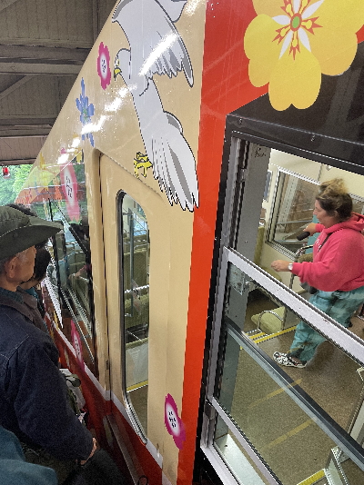 添乗員さんに10:20に改札に集合と案内され、電気バスのオブジェの前で記念写真を撮ったり、スタンプラリー帳を見つけたのでスタンプ押したりする。紙とは別にデジタルスタンプ用のQRが案内されていたので、カメラでurlを読み込むことに。2階でスタンプを押すことができたが1階にも有るとのことだったので、私は改札の列に並び、スマホをかーちゃんに渡して押しに行ってもらった。