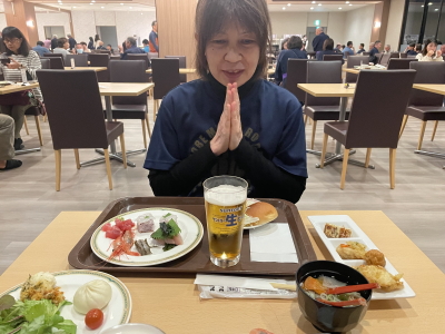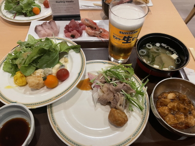 18時前にホテルへ到着。今日はまず温泉に入ってゆっくりすることに。露天風呂でしっかり疲れをとった後、部屋でゆっくりし19:20レストランへ。多国籍バイキングなのかよくわからない料理がたくさん並んでいた。どれも美味しかったし、何より生ビールが飲み放題。20:30までゆっくりと酔っぱらいました。