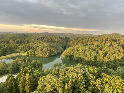 すぐに220段あるというダム展望台へ向かうため右に曲がる。途中、休憩スペースや湧き水飲み場もあったが苦も無く展望台到着。雨も降っておらず、綺麗な緑色のダム湖が感動的だ。自撮り棒でツーショットの写真を撮ったらデジタルスタンプをGET。