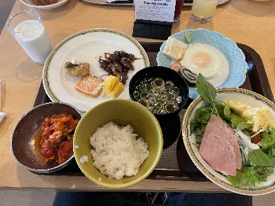 翌朝は5:30から散歩、戻って温泉入って朝食は7:20から。出発が9時だったのでゆっくり頂くことができました。